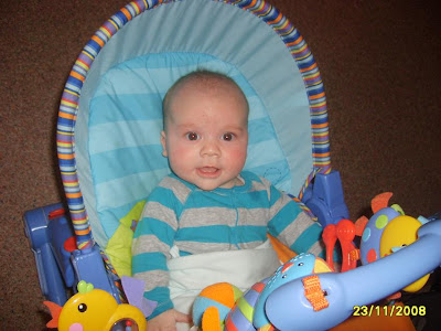 Today was also another milestone for Hunter, besides a record breaking sleep. He rolled over for the first time from his back onto his tummy. And I missed it! I was reading and he was on his playmat when all of a sudden I heard him rip out this massive burp, lol. He often burps if he's on his tummy, so I look up (he has been trying to roll over for a while now) and he is on his tummy! He couldn't roll back so I got up and rolled him back over and found this....